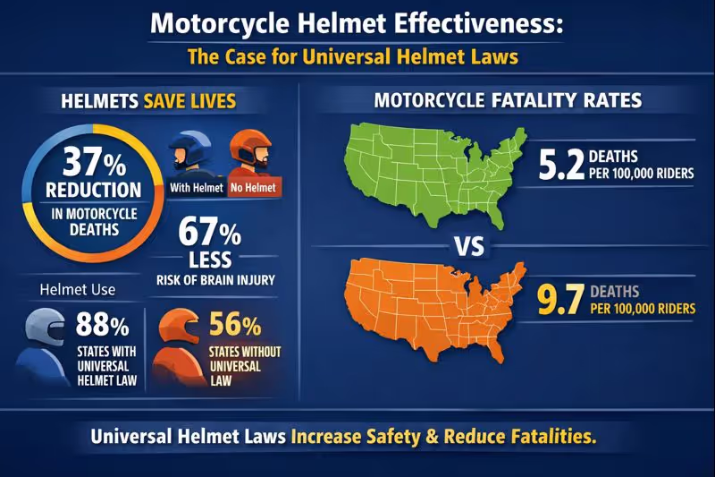 The impact of these laws on fatalities is dramatic and well-documented. In states with universal helmet laws, only 11% of motorcyclists killed in 2022 were not wearing helmets. In states without universal laws, that figure rises to 54% — nearly half of all fatalities occurring among unhelmeted riders. Historical data reinforces this pattern: when Texas had a universal helmet law from 1968 to 1977, an estimated 650 lives were saved. When the law was weakened to apply only to riders under 18, fatalities increased 35%. Similar patterns have repeated across states that have enacted, repealed, or modified their helmet requirements.
